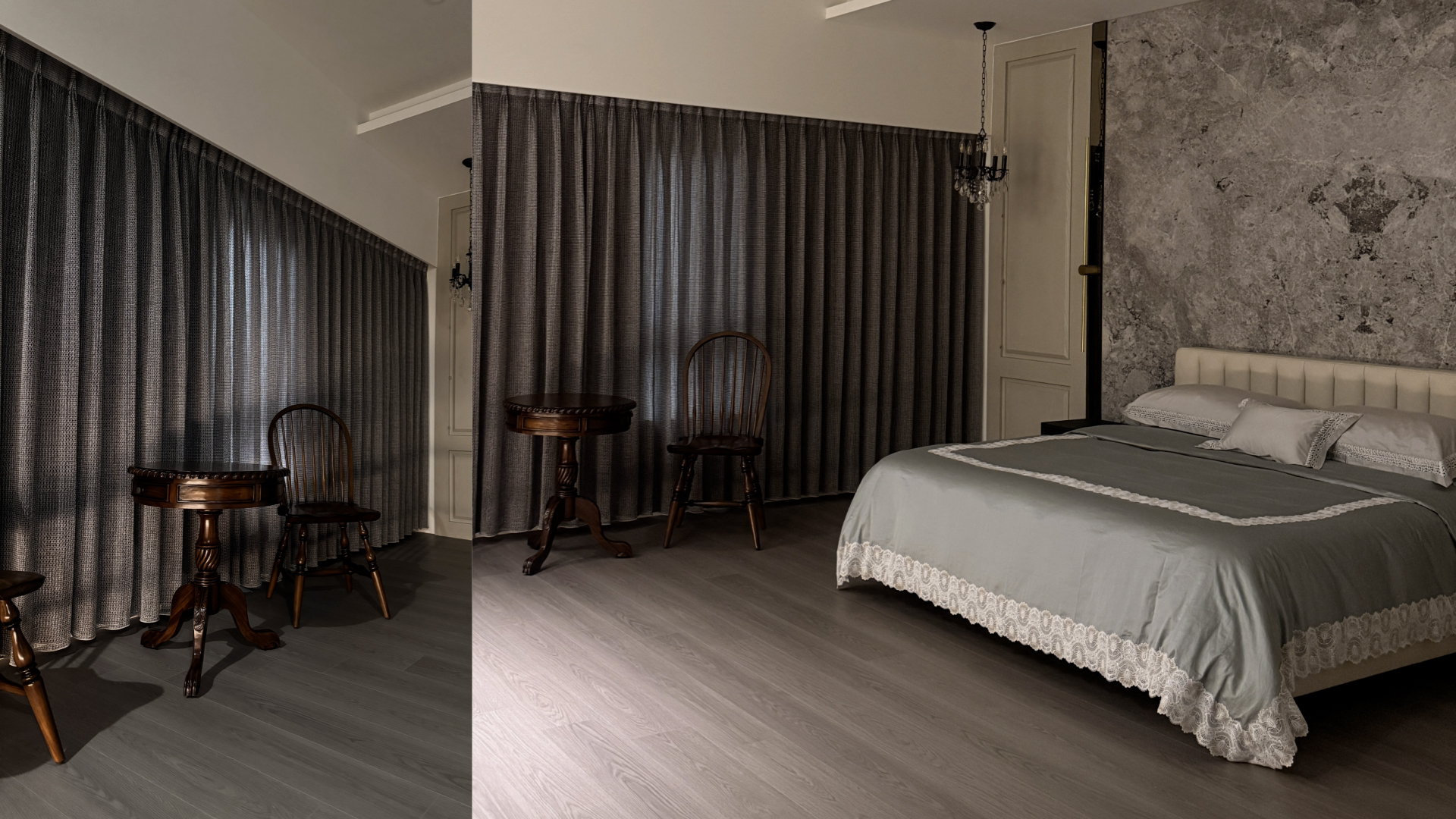布簾在拉上時可有效阻隔光線及外部干擾,整體以低調、安定為主軸,讓臥室回歸單純休息的本質,營造安心且放鬆的睡眠環境。