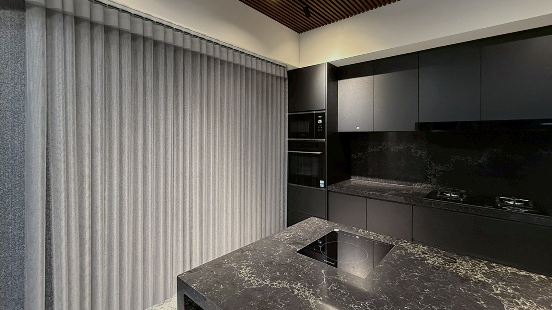 廚房空間選用直立柔紗簾,可透過旋轉葉片角度,實現全開、半透、全遮蔽等多種模式,讓廚房可以依照屋主需求,靈活調整採光與隱私。