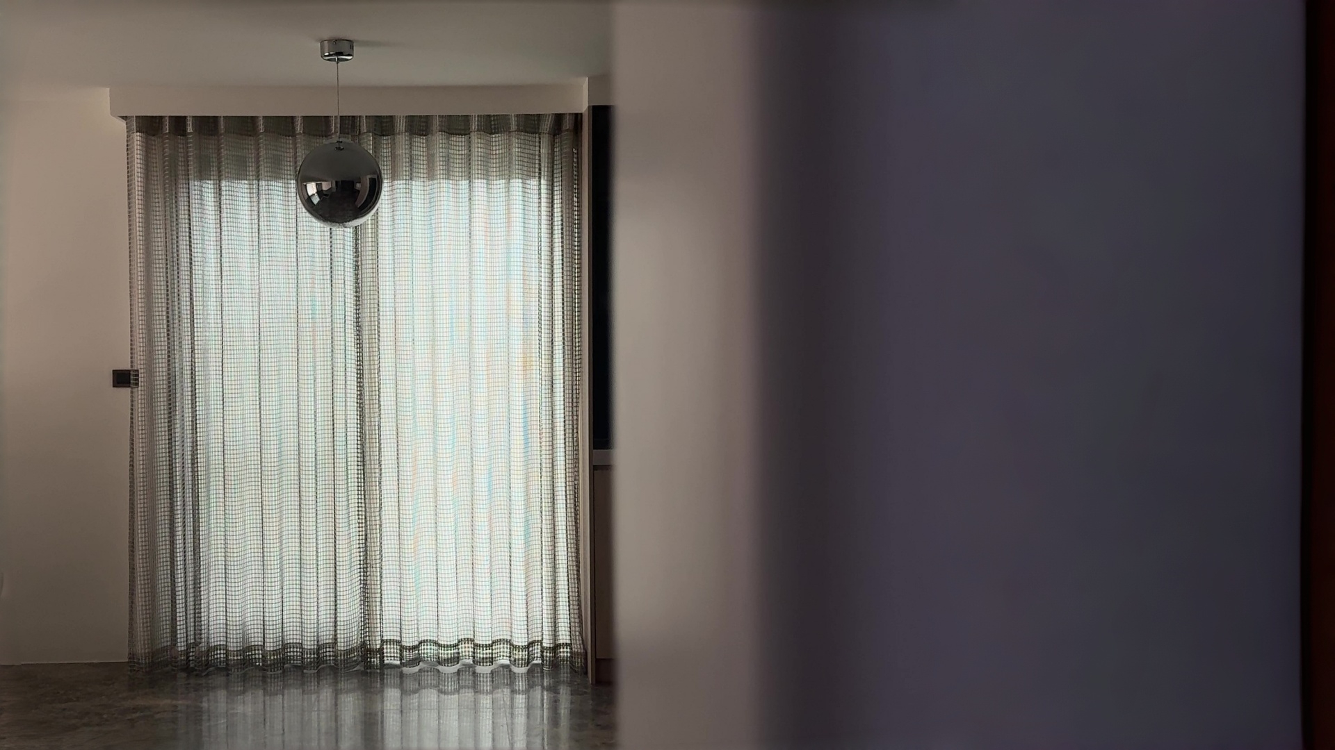 前陽台為進出頻繁的動線空間,因此規劃電動摺景布簾搭配紗簾,兼顧遮蔽與彈性使用。