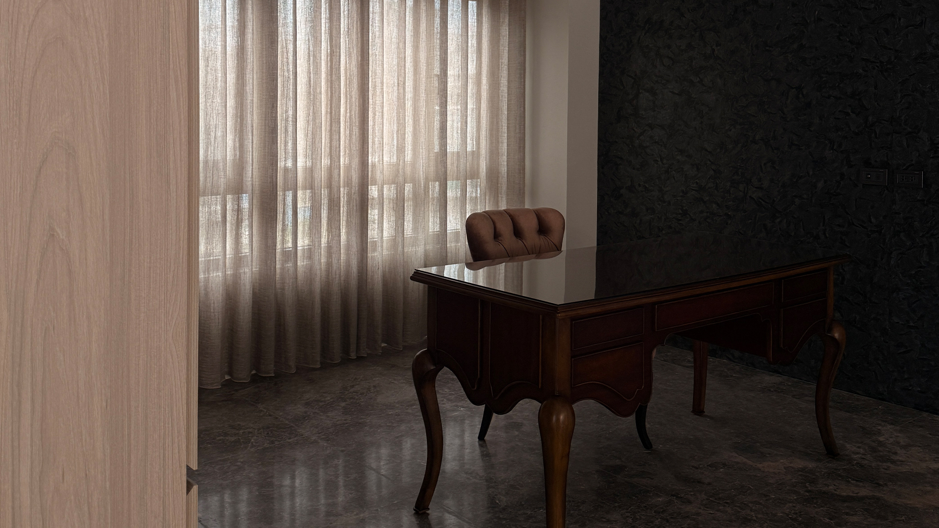 在設計上,考量空間中有水晶吊燈、大理石等現代輕奢元素,我們依照屋主的喜好,選用具有質感層次的布料搭配,例如客廳帶有細緻紋理的藏青色布簾、陽台通道的雙層網狀紗簾……等,呈現出與空間一致的優雅氛圍。